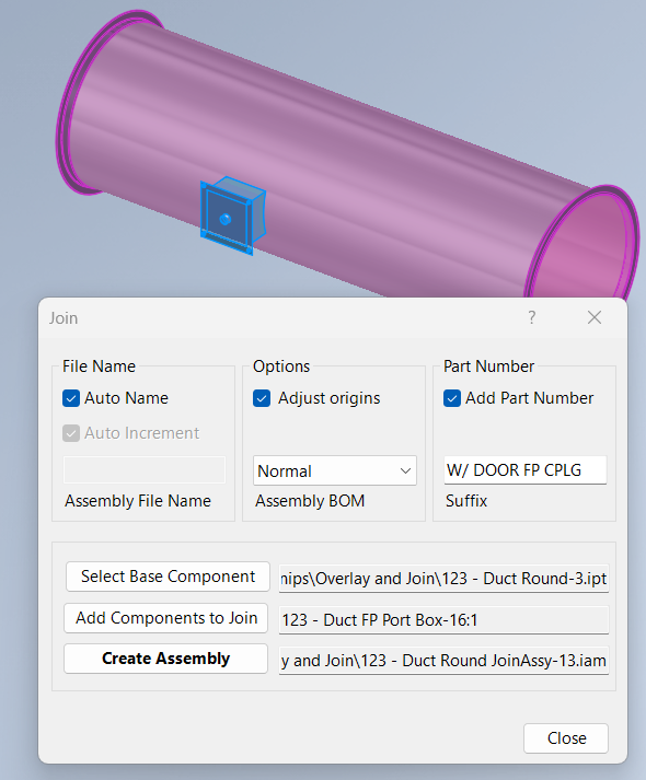 Join is a command for combining multiple components into a new assembly, using a selected base component as the main part. This tool streamlines the process of creating custom assemblies, such as duct fittings with attached doors, test ports, or other accessories.