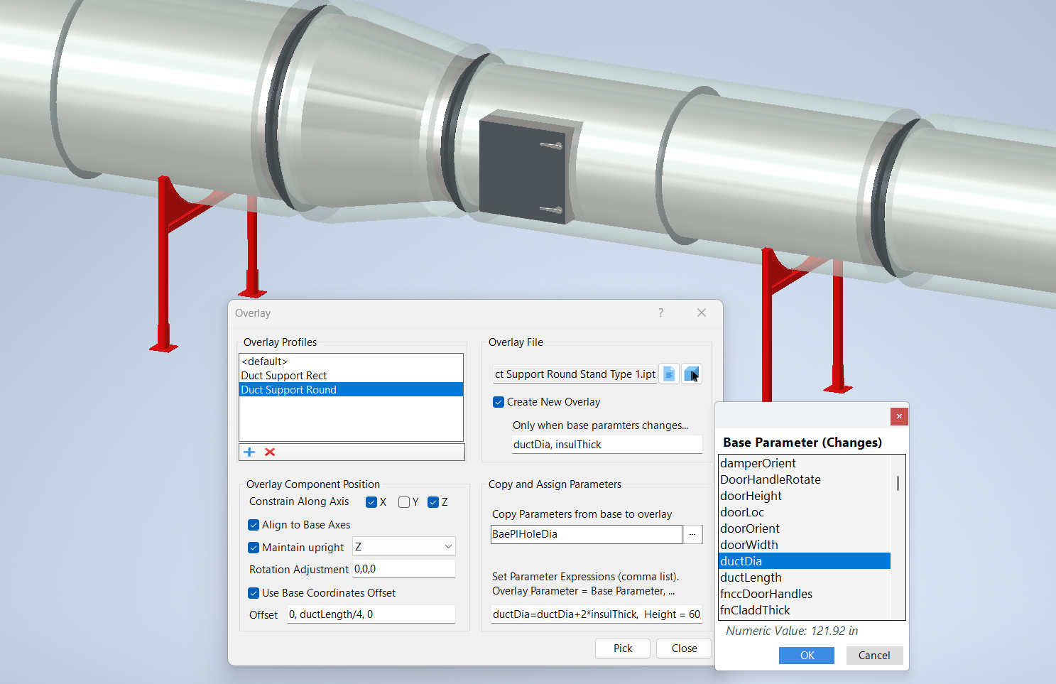 In the example below, a duct support stand is selected as the overlay and the duct fitting was selected as the base component. Each time a duct fitting is selected, a duct stand component is placed, which is a new component if the parameters ductDia or insulThick in the base have changed since the previous placement.