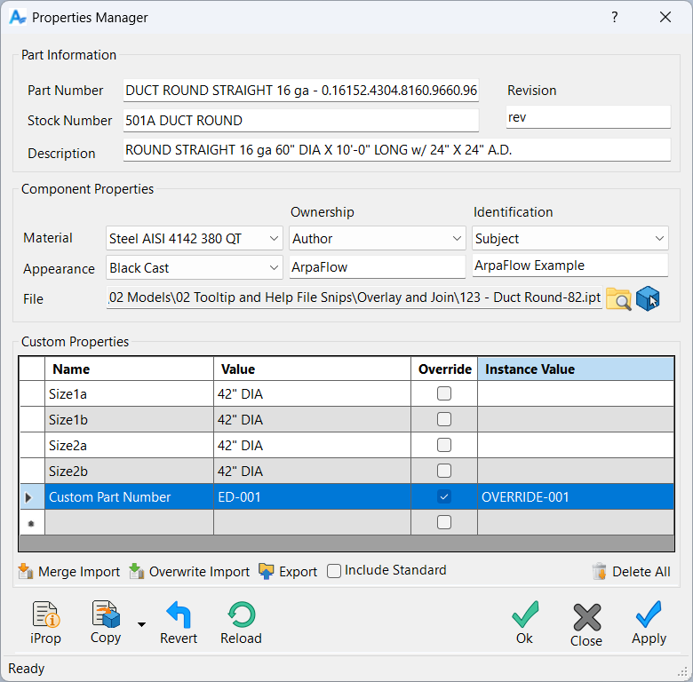 Merge Import is ideal when you want to supplement or update a component’s properties without removing anything. When the Include Standard option is enabled, standard iProperties such as part information and ownership fields are also updated as part of the merge.